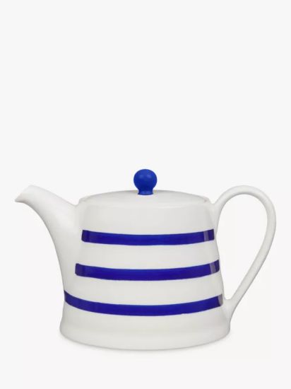 This traditional striped teapot features a hand-painted design inspired by the seaside and the ocean. Made of ceramic, it is dishwasher and microwave safe.