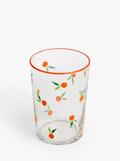 Glass with orange fruit pattern, machine screen printed with organic inks.